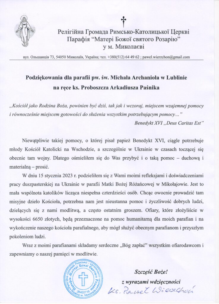Podziękowania za pomoc Kościołowi na Ukrainie
