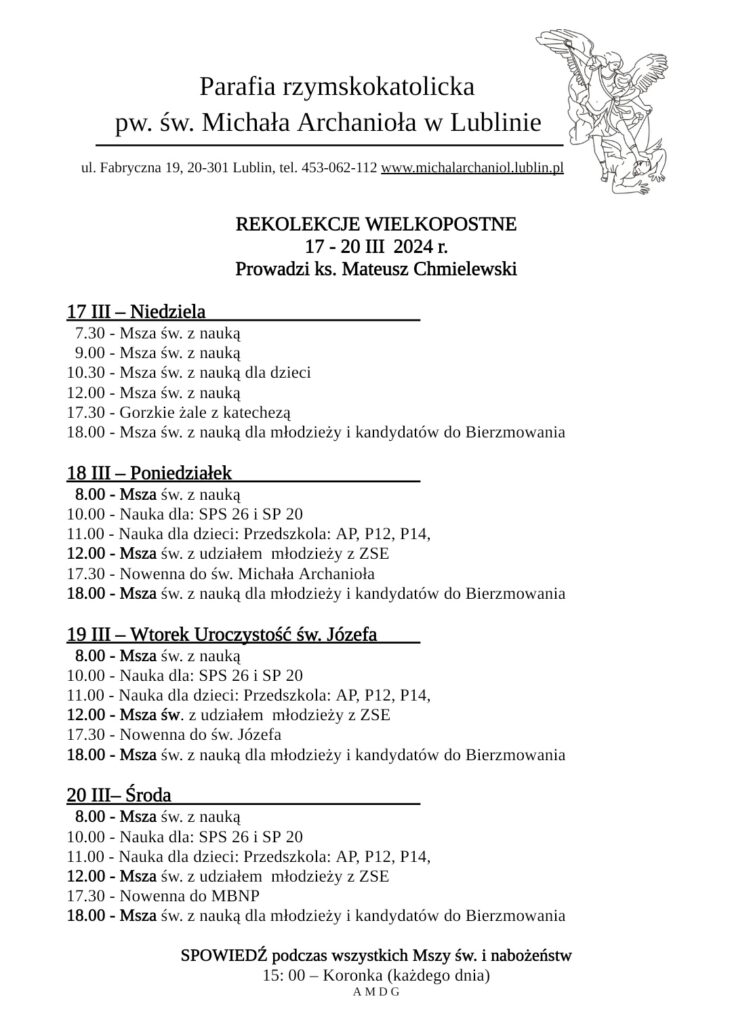 OGŁOSZENIA PARAFIALNE V NIEDZIELA WIELKIEGO POSTU REKOLEKCJE 17-20.03.2024 r.