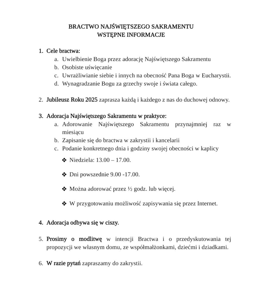 2. Zapraszamy naszych Parafian do włączenie się do Bractwa Najświętszego Sakramentu, którego celem jest uwielbienie Boga, i własne uświęcenie, oraz wynagrodzenie Bogu za grzechy swoje i świata całego.
