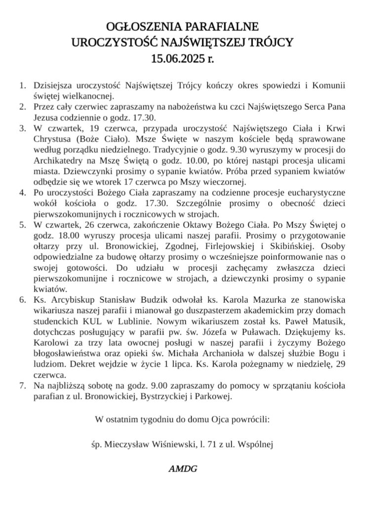 OGŁOSZENIA PARAFIALNE UROCZYSTOŚĆ NAJŚWIĘTSZEJ TRÓJCY 15.06.2025 r.