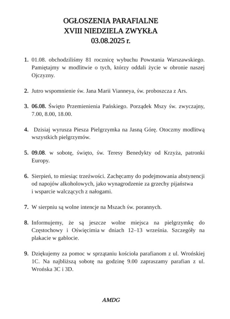 OGŁOSZENIA PARAFIALNE XVIII NIEDZIELA ZWYKŁA 03.08.2025 r.