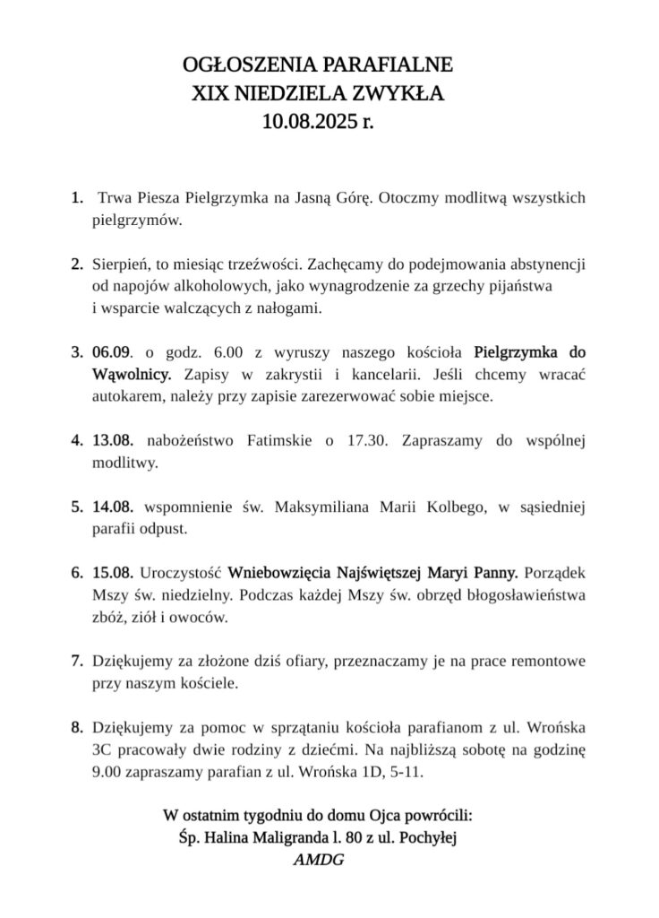 OGŁOSZENIA PARAFIALNE XIX NIEDZIELA ZWYKŁA 10.08.2025 r.