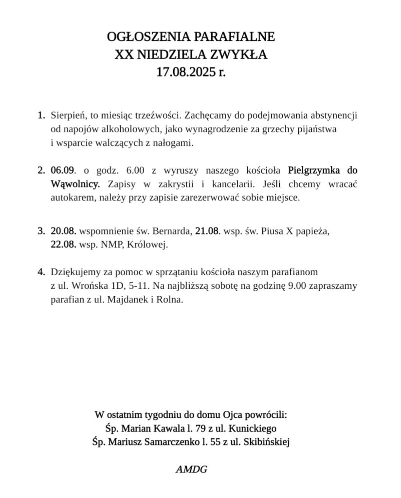 OGŁOSZENIA PARAFIALNE XX NIEDZIELA ZWYKŁA 17.08.2025 r.