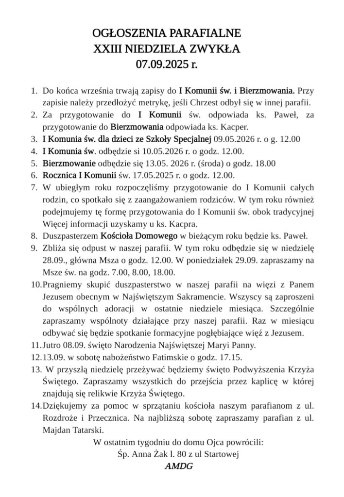 OGŁOSZENIA PARAFIALNE XXIII NIEDZIELA ZWYKŁA 07.09.2025 r.