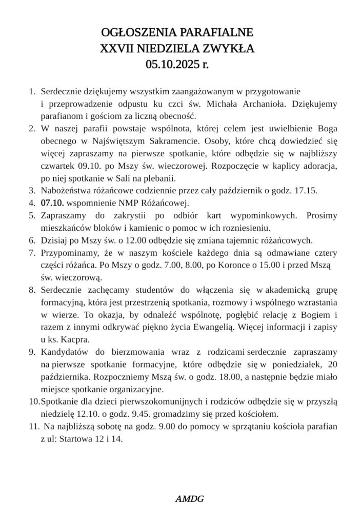OGŁOSZENIA PARAFIALNE XXVII NIEDZIELA ZWYKŁA 05.10.2025 r.
