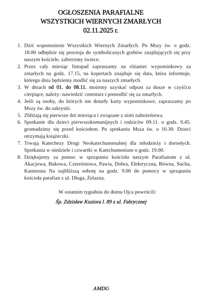 OGŁOSZENIA PARAFIALNE WSZYSTKICH WIERNYCH ZMARŁYCH 02.11.2025 r.
