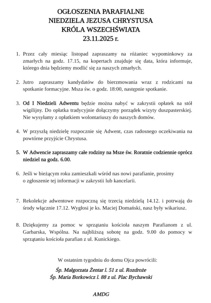 OGŁOSZENIA PARAFIALNE NIEDZIELA JEZUSA CHRYSTUSA KRÓLA WSZECHŚWIATA 23.11.2025 r.