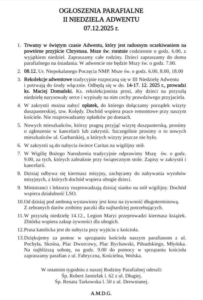 OGŁOSZENIA PARAFIALNE II NIEDZIELA ADWENTU 07.12.2025 r.